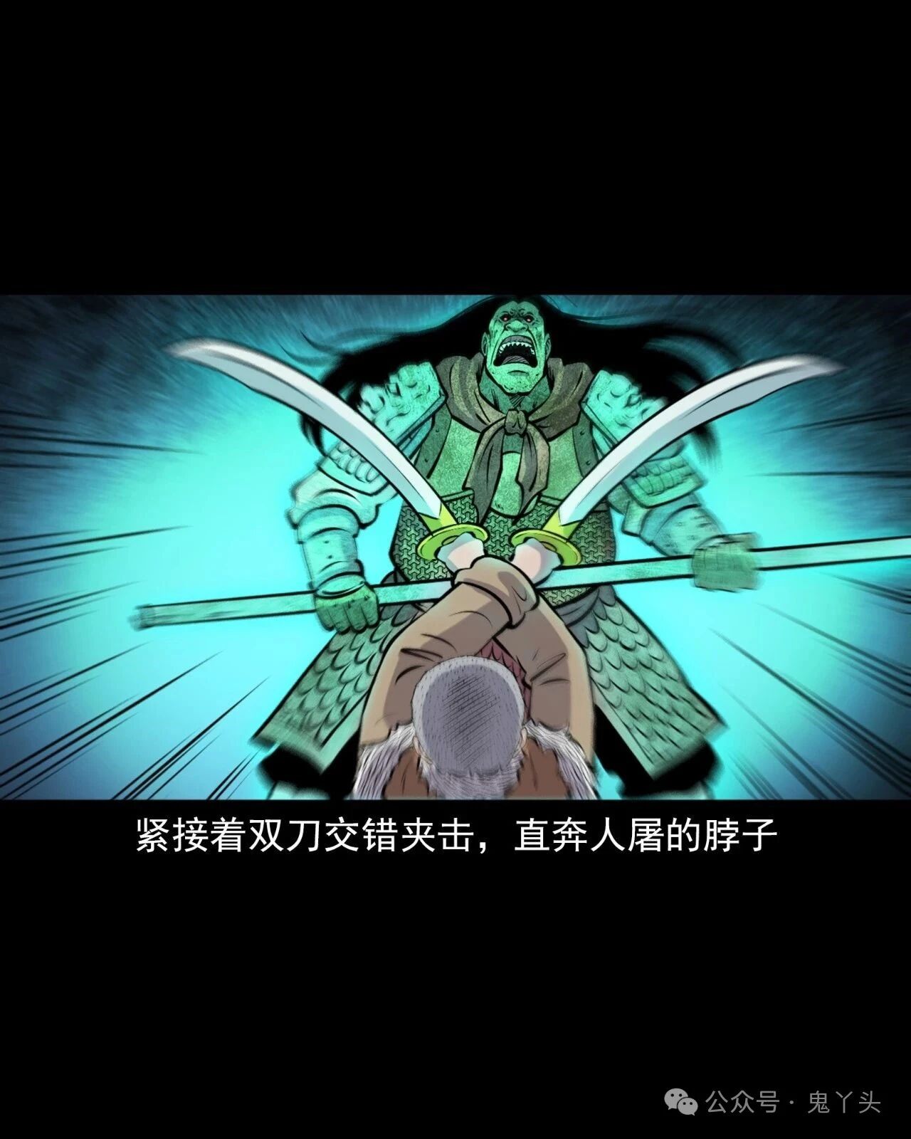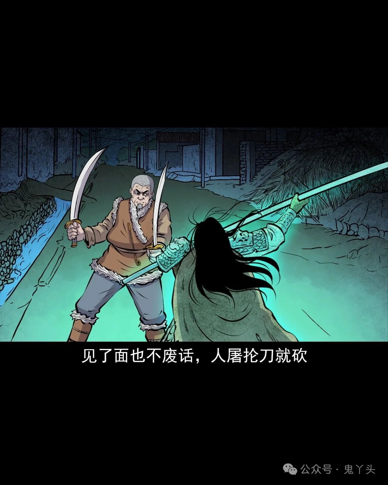 上一回咱们说到老烟鬼找到了人屠!见了面也不废话,人屠抡刀就砍,老烟鬼用双刀一迎,挡下了这一击!紧接着双刀交错夹击,直奔人屠的脖子,人屠忙举刀格挡,老烟鬼一纵身飞过了人屠的头顶,人屠仰头一看,面露惧色!老烟鬼双刀成剪直扑而下,人屠仿佛间看到了一个宿