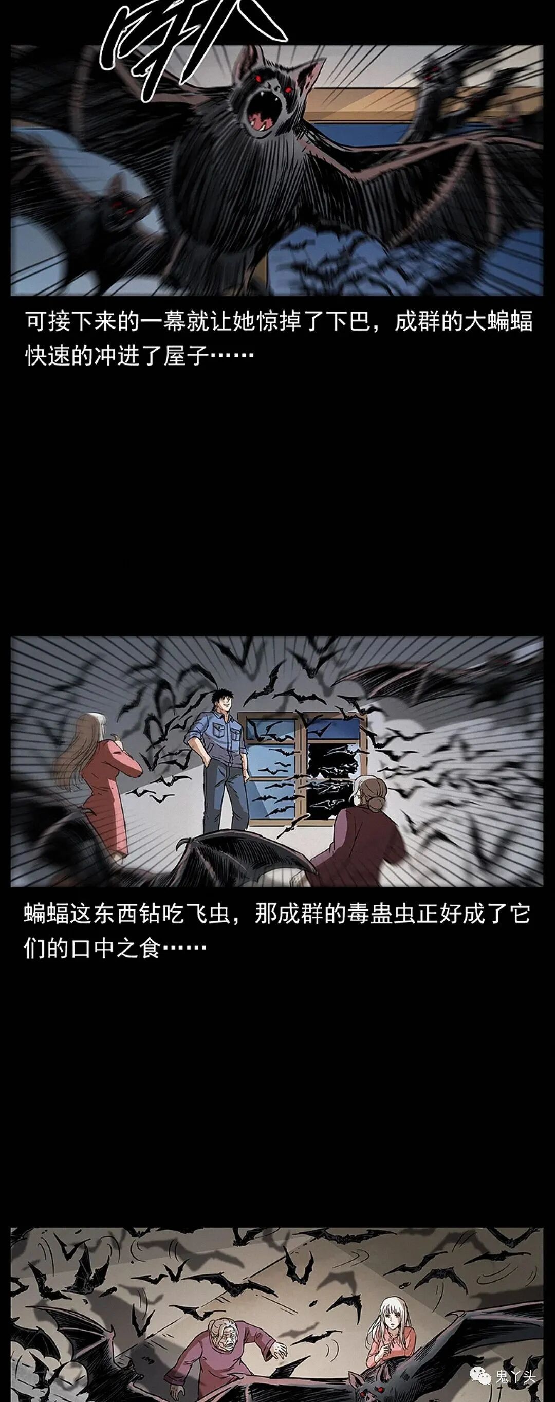 书接前文,那老蛊婆恼羞成怒,手臂一挥无数的毒虫就飞向了陈小狗,但是陈小狗没有显出一丝的慌乱,手轻轻的一挥向着窗户砸去,一声脆响,玻璃顿时就碎了,面前的老蛊婆一时间没有反应过来,这小子难道是想从窗户逃走吗?可接下来的一幕就让她惊掉了下巴,成群的大蝙蝠快速的冲进了屋子,蝙蝠这东西钻吃飞虫,那成群的毒蛊虫正好成了它们的口中之食,看到这那老蛊婆哪还能不明白,这年轻人能控制生灵,自己今天算是碰到了克星,吃完蛊虫后的蝙蝠并没有离去,而是一掉头又扑向那老蛊婆,看着那些乌黑的蝙蝠冲来,吓得那落花洞女连连尖叫,可是她马上又反应了过来,那些蝙蝠并没有攻击自己,她诧异的抬头看去……幽冥诡匠第302话之《让人头大的落花洞女》