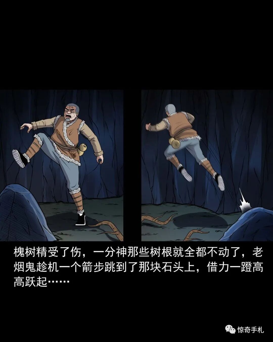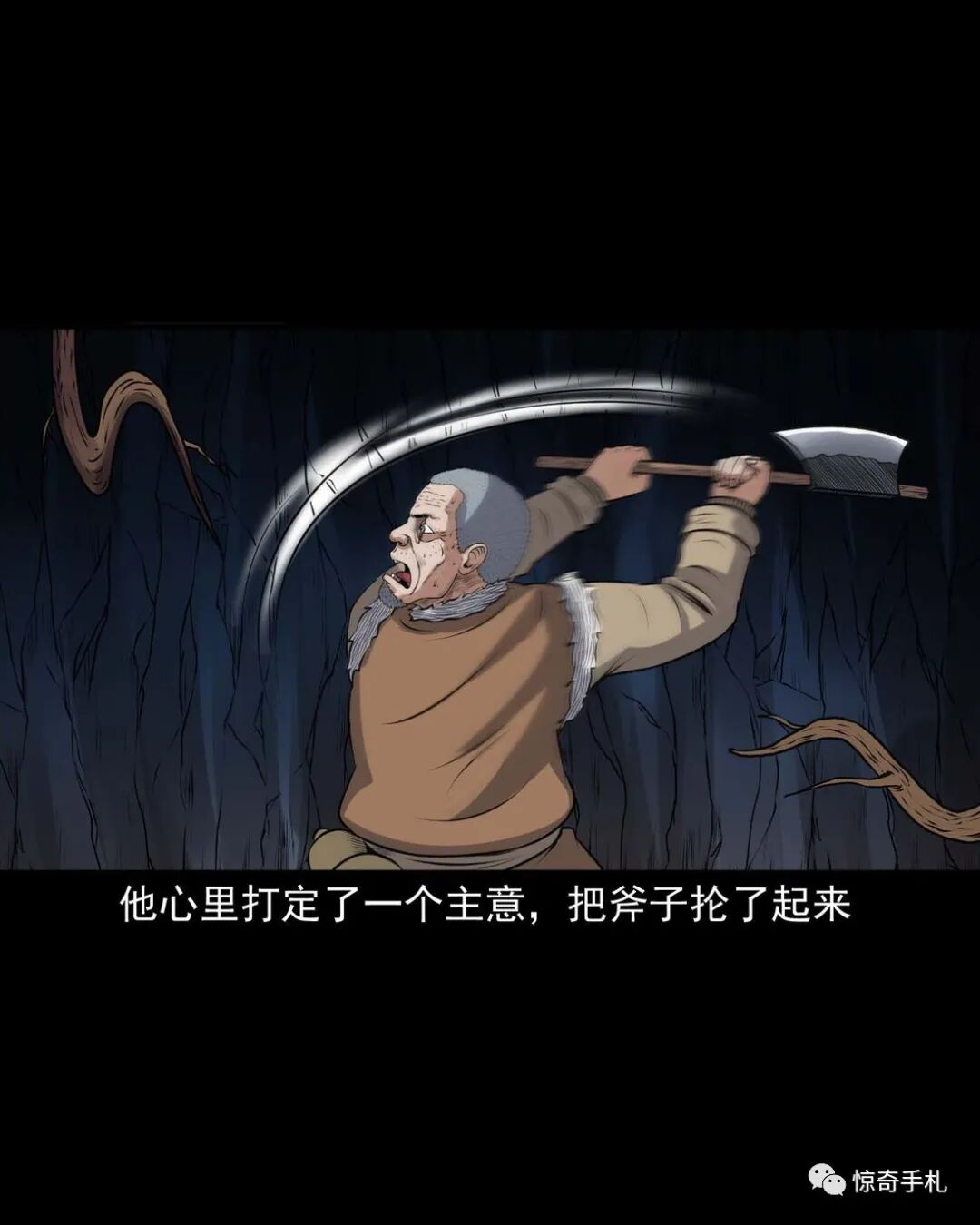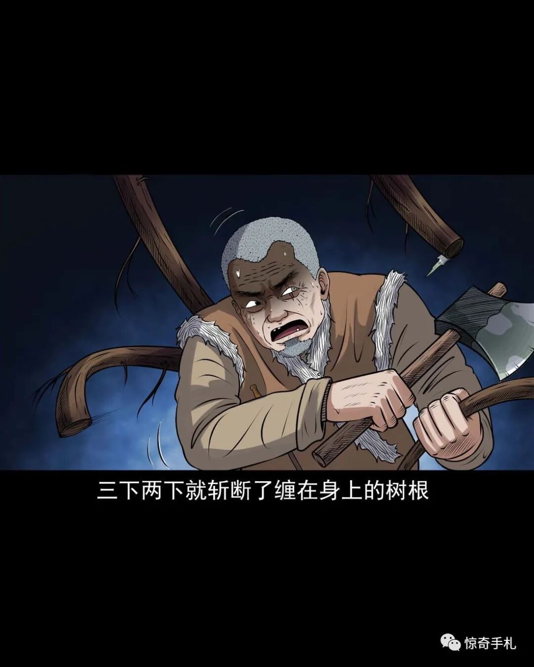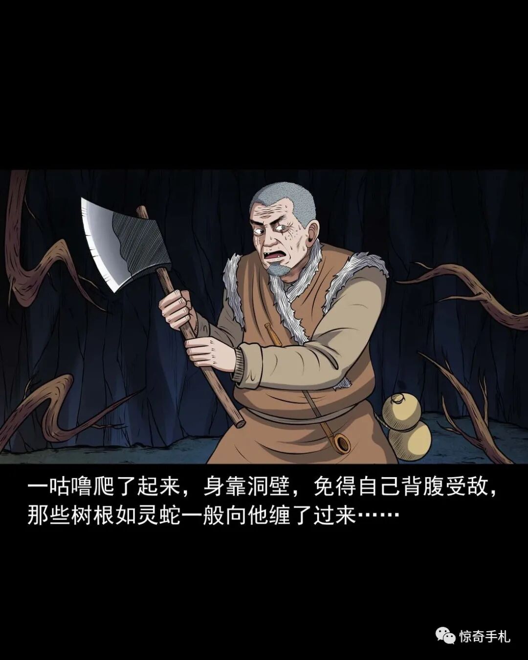 上一回咱们说到老烟鬼借到了斧子,闯进了槐树精的洞府讨要红丫头,可那槐树精根本不知道老烟鬼要找的是谁,老烟鬼本想找林中女鬼问问红丫头被藏在哪了,可往洞里看了看也不见那林中女鬼,槐树精被老烟鬼的行径激怒了,要给老烟鬼点颜色看看,他人虽没动,可地面动了,一根树根从地下猛地钻了出来,缠在了老烟鬼的小腿上,往回这么一收,把老烟鬼扯了个跟头,紧接着地面下又钻岀来几根树根,蜿蜒着伸向老烟鬼,老烟鬼挥起斧子,砍断了脚上的树根,咕噜爬了起来,身靠洞壁,免得自己背腹受敌那些树根如灵蛇一般向他缠了过来……三老爷惊奇手札之《老烟鬼(48)》