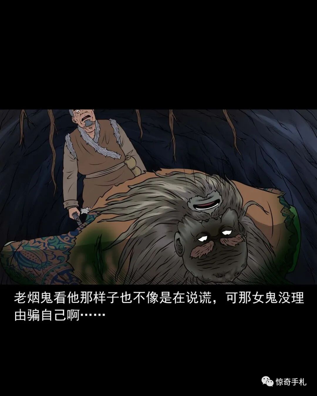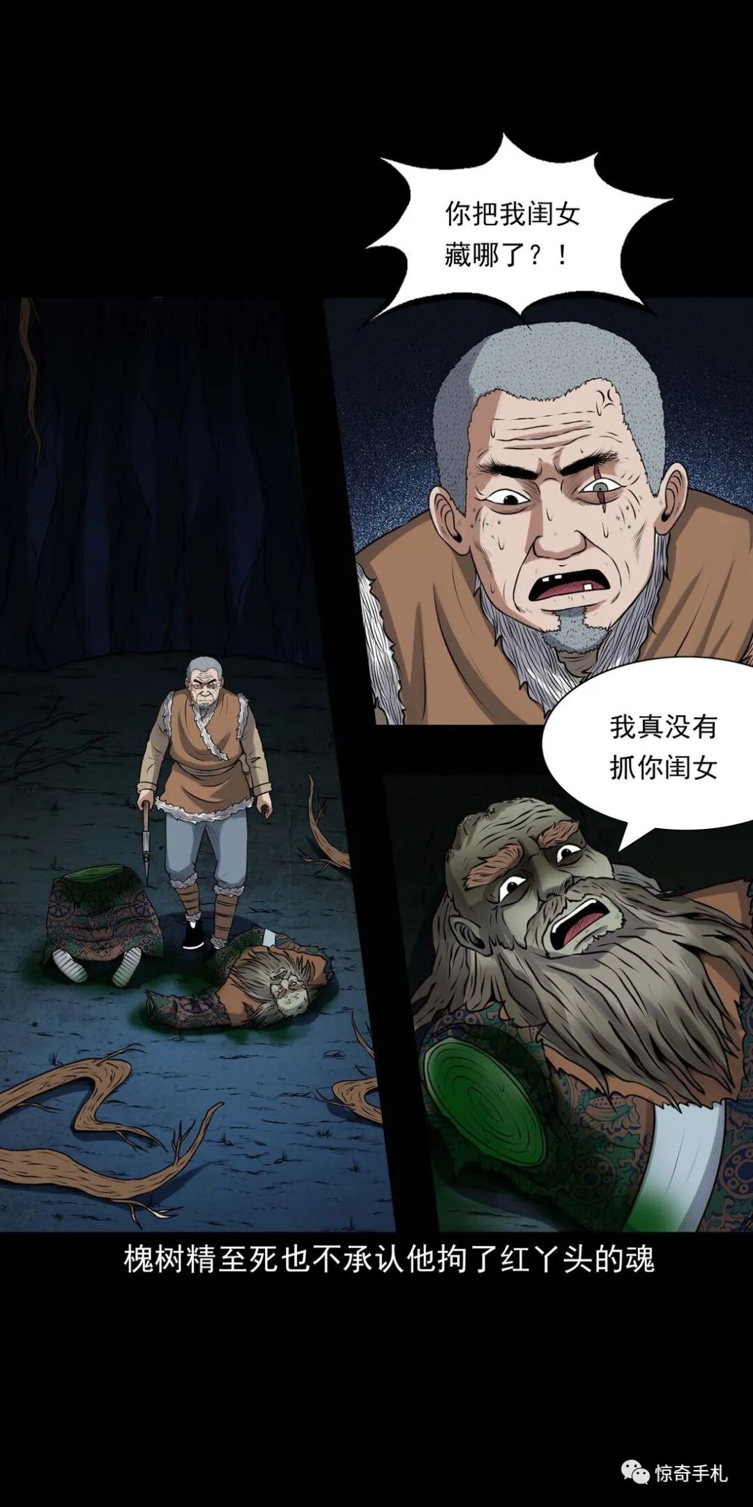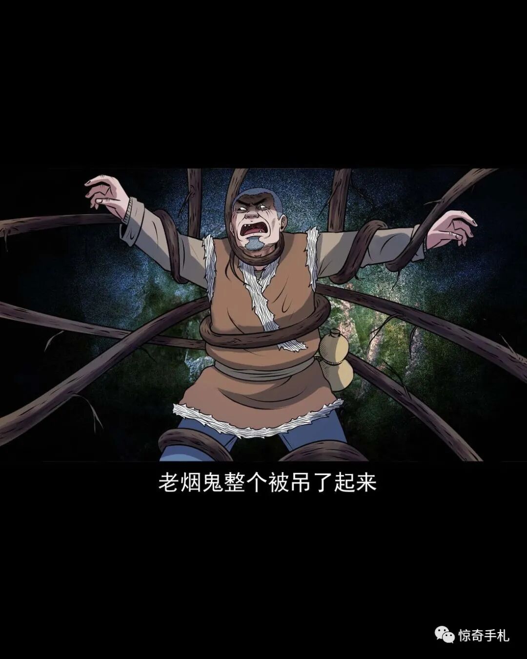 上一回咱们说到老烟鬼借到了斧子,闯进了槐树精的洞府讨要红丫头,可那槐树精根本不知道老烟鬼要找的是谁,老烟鬼本想找林中女鬼问问红丫头被藏在哪了,可往洞里看了看也不见那林中女鬼,槐树精被老烟鬼的行径激怒了,要给老烟鬼点颜色看看,他人虽没动,可地面动了,一根树根从地下猛地钻了出来,缠在了老烟鬼的小腿上,往回这么一收,把老烟鬼扯了个跟头,紧接着地面下又钻岀来几根树根,蜿蜒着伸向老烟鬼,老烟鬼挥起斧子,砍断了脚上的树根,咕噜爬了起来,身靠洞壁,免得自己背腹受敌那些树根如灵蛇一般向他缠了过来……三老爷惊奇手札之《老烟鬼(48)》
