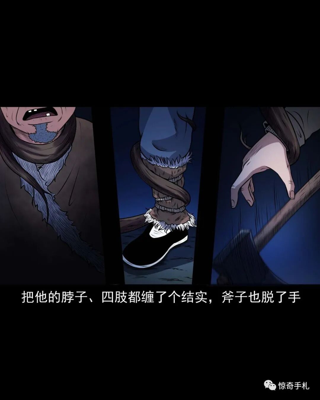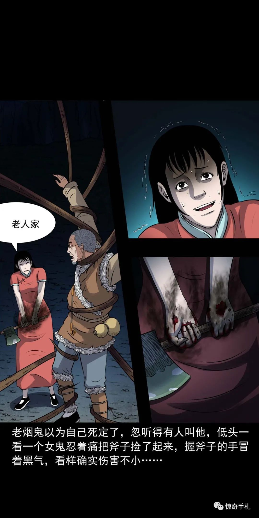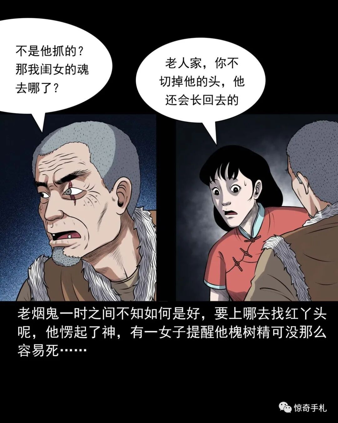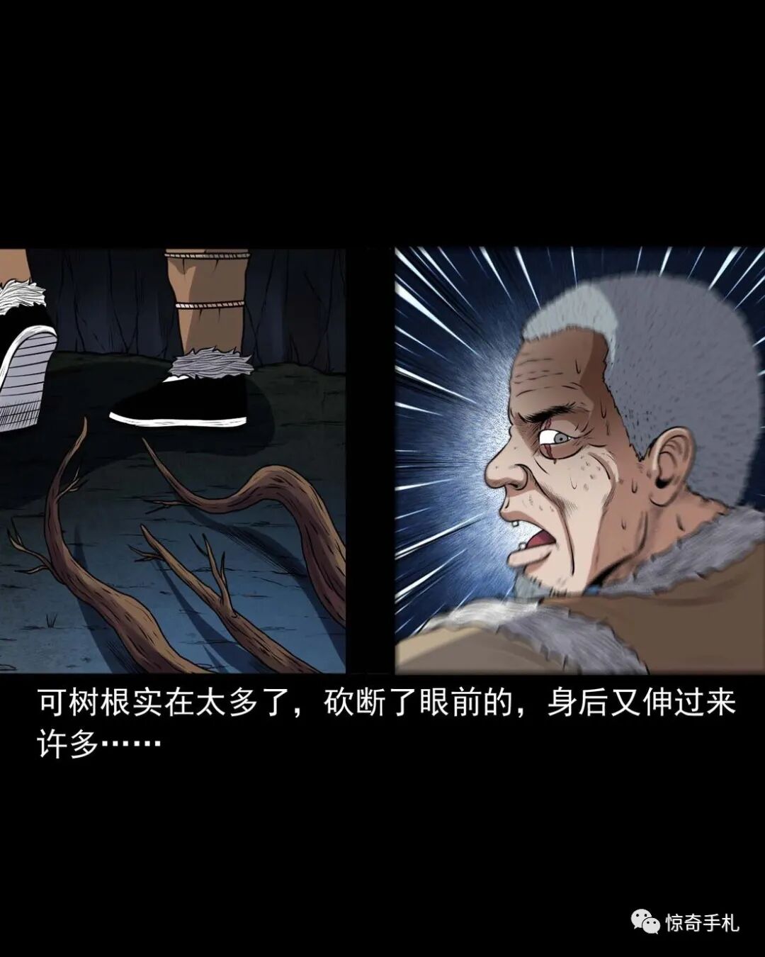 上一回咱们说到老烟鬼借到了斧子,闯进了槐树精的洞府讨要红丫头,可那槐树精根本不知道老烟鬼要找的是谁,老烟鬼本想找林中女鬼问问红丫头被藏在哪了,可往洞里看了看也不见那林中女鬼,槐树精被老烟鬼的行径激怒了,要给老烟鬼点颜色看看,他人虽没动,可地面动了,一根树根从地下猛地钻了出来,缠在了老烟鬼的小腿上,往回这么一收,把老烟鬼扯了个跟头,紧接着地面下又钻岀来几根树根,蜿蜒着伸向老烟鬼,老烟鬼挥起斧子,砍断了脚上的树根,咕噜爬了起来,身靠洞壁,免得自己背腹受敌那些树根如灵蛇一般向他缠了过来……三老爷惊奇手札之《老烟鬼(48)》